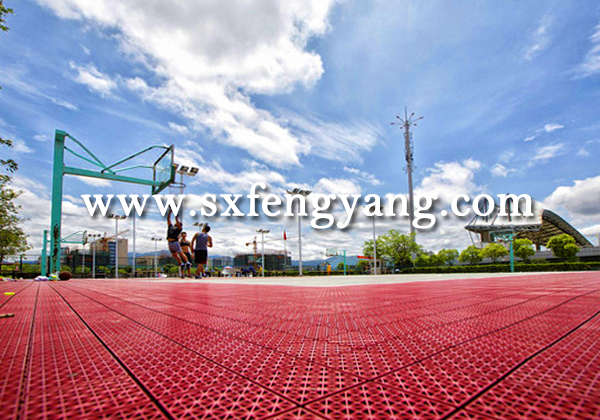 6、耐用性:該產(chǎn)品所用原料聚丙。≒P)為高強(qiáng)度材料,加入具有抗紫外線輻射、抗氧化、抗寒等原料的改性聚丙稀,使該產(chǎn)品具有耐壓、耐沖擊、耐高低溫、使用壽命長(zhǎng)等優(yōu)點(diǎn)。耐候性極高,不怕日曬高溫、雨淋潮濕、冰雪嚴(yán)寒、永不翹曲剝落變形。沒有氣候地域限制,雨后場(chǎng)地不積水。